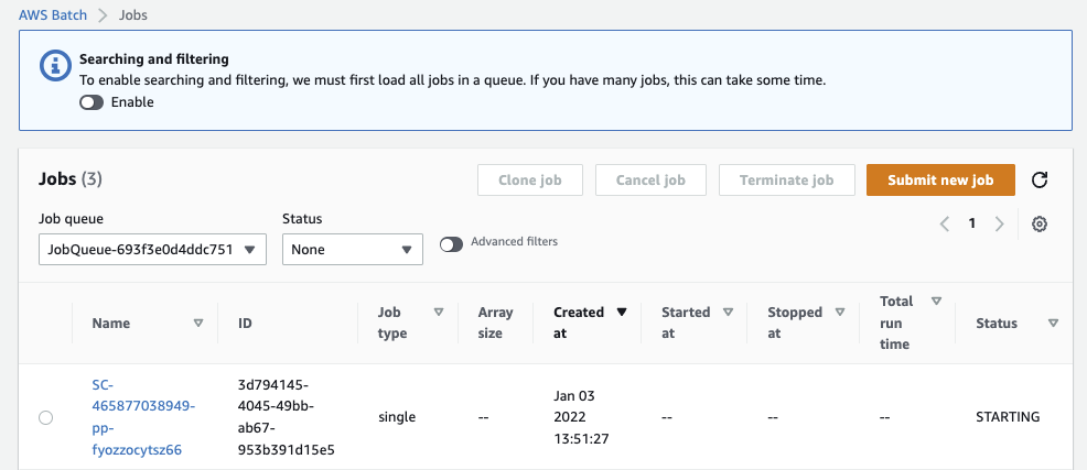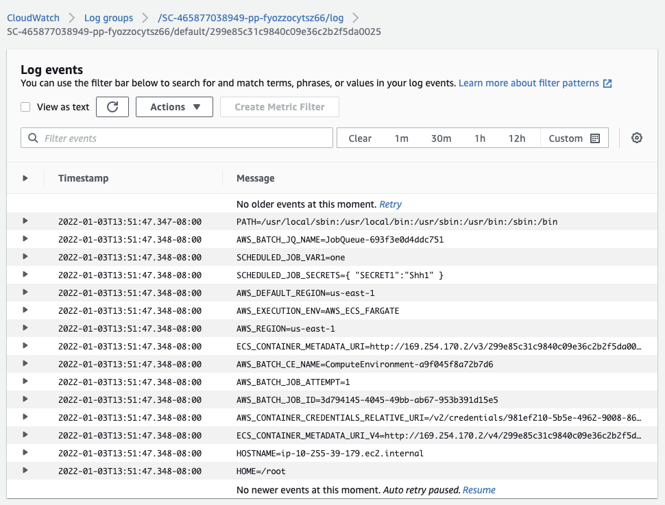 To access the job secrets using either the AWS CLI or one of the AWS SDKs you must copy the “JobSecretArn” from the service catalog PROVISION_PRODUCT outputs. Then provide the JobSecretArn to either the AWS secrets manager CLI or one of the AWS SDKs to retrieve the secret.