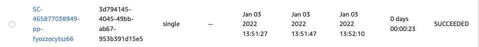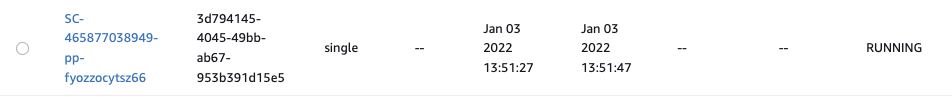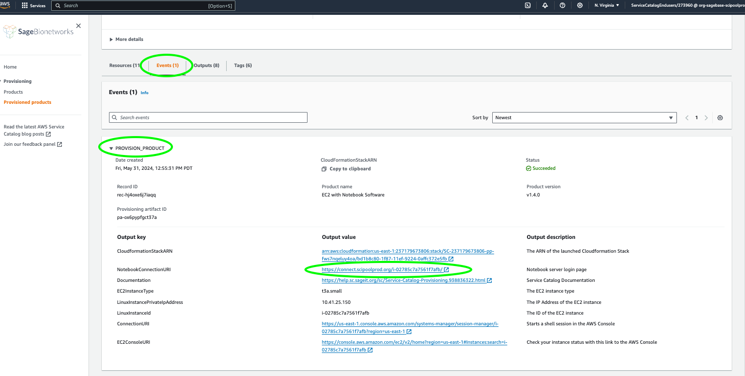 A new instance takes a few minutes to be created. Once complete, it will appear in the “Provisioned Products” list, showing status Available. Select “Provisioned Product Details” from the navigation panel on the left, and click on your product. A product that has a “Succeeded” event will have outputs that include links for connecting. Click on the "Events" tab, find the "PROVISION_PRODUCT" card (which may require sorting Events by Date, oldest first) and expand the card to see the following links.
