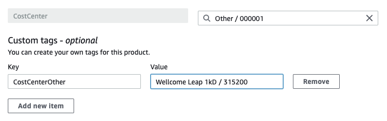 CostCenter: bill the product to this cost center code. If the appropriate cost center code is not in the list then select “Other / 000001” and create a custom “CostCenterOther” tag. Set the tag to a value from our official list of cost centers codes. Example: