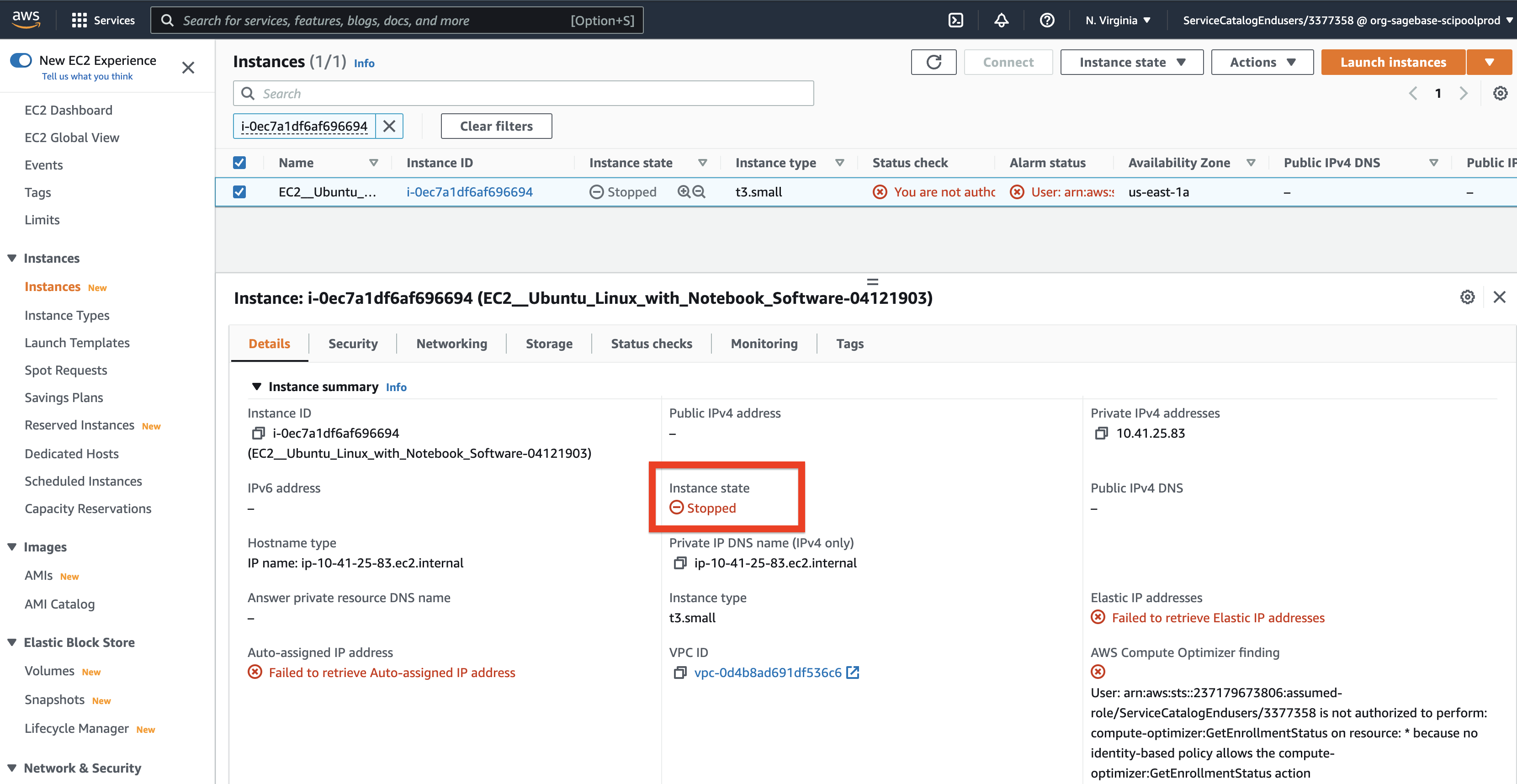 runningstate. If it’s not in the running state goto the service catalog console and select the EC2 instance then select Actions → StartIf you still cannot access your EC2 instance the cause might be that your disk volume is completely full. If this happens you will need to contact Sage IT for help and provide your EC2 instance ID.