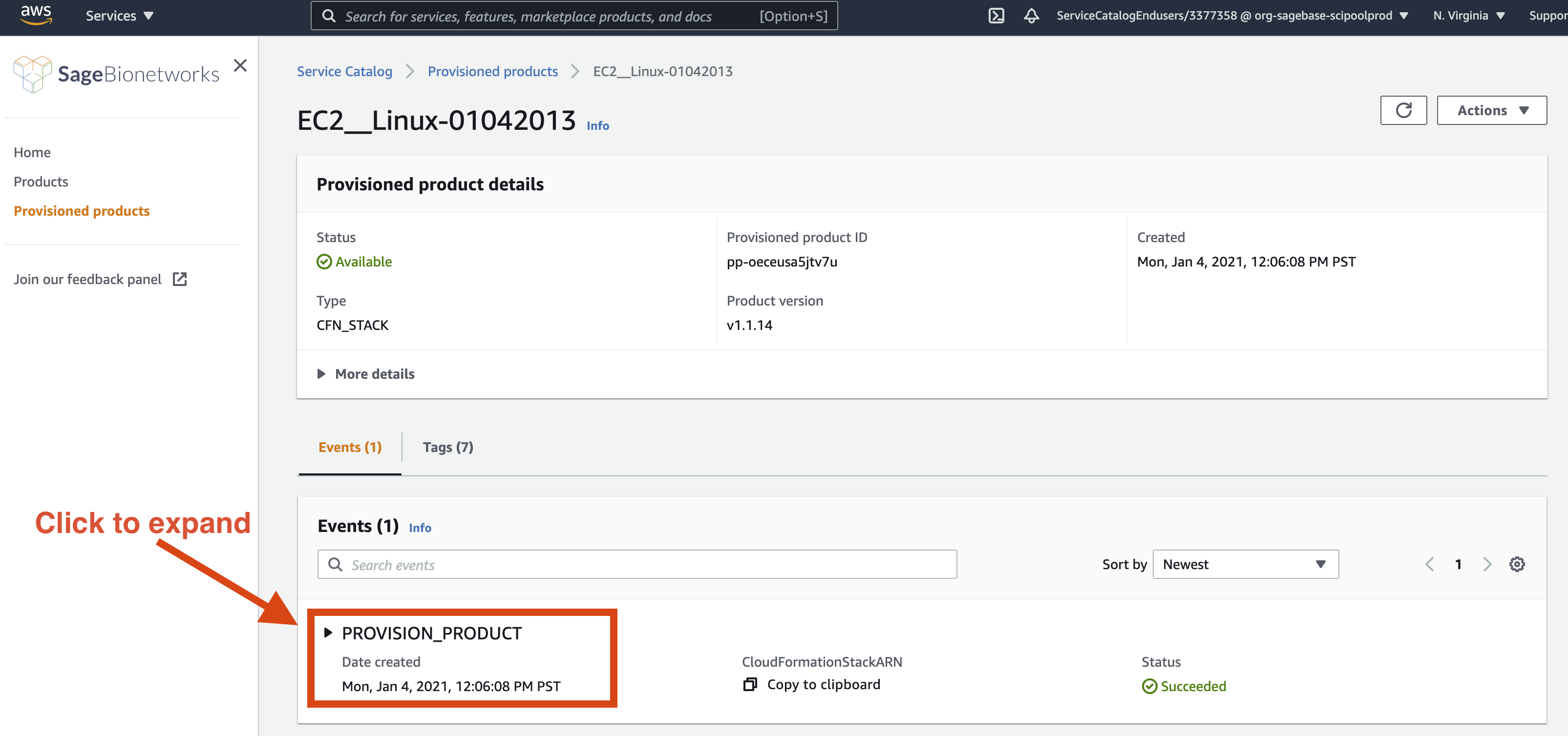 ~/.aws/configfile, replacing<PERSONAL_ACCESS_TOKEN>with the PAT you downloaded then set the/absolute/path/to/synapse_creds.shto the location of thesynapse_creds.shorsynapse_creds.batfile.CODE[profile service-catalog] region=us-east-1 credential_process = "/absolute/path/to/synapse_creds.sh" "https://sc.sageit.org" "<PERSONAL_ACCESS_TOKEN>"Go to the service catalog provisioned product page. Scroll down to get your